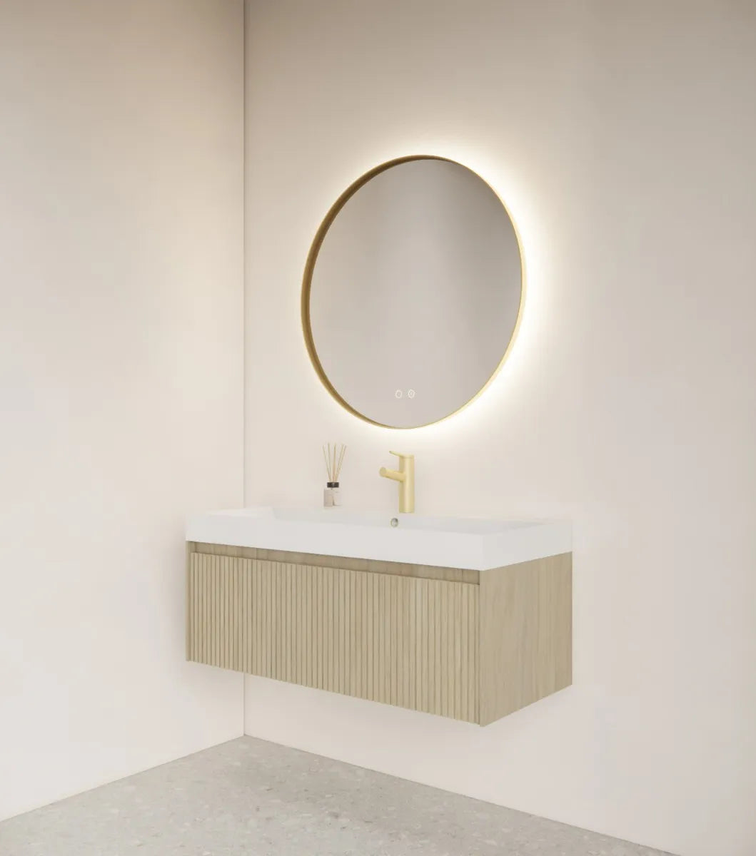 Deze variant van Gliss Design heeft een gouden rand. Extra mooi als je de LED-verlichting aan zet. Die zet je eenvoudig aan met de touchknop aan de voorkant en op dezelfde manier kan je de verlichting ook dimmen. Naast de verlichting heeft deze topper ook spiegelverwarming: een echte wauw spiegel dus!