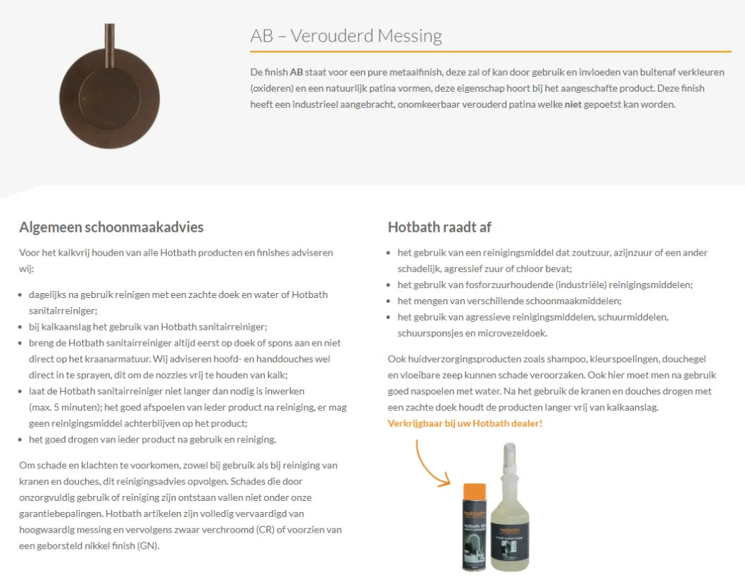 Om schade en klachten te voorkomen, zowel bij gebruik als bij reiniging van kranen en douches, dit reinigingsadvies opvolgen. Schades die door onzorgvuldig gebruik of reiniging zijn ontstaan vallen niet onder onze garantiebeCobberingen. Hotbath artikelen zijn volledig vervaardigd van hoogwaardig messing.