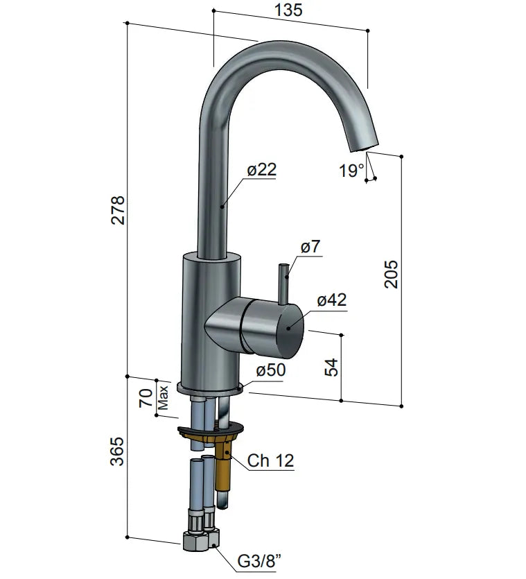 De wastafelmengkraan is voorzien van een draaibare uitloop. Dat kan praktisch zijn voor het schoonmaken van de wasbak en voor het gemak. De kraan is 27.8cm hoog en de gebogen uitloop met perlator is 20.5cm hoog. Daarnaast heeft de Cobber wastafelmengkraan een hendel waarmee u de temperatuur van het water bedient.