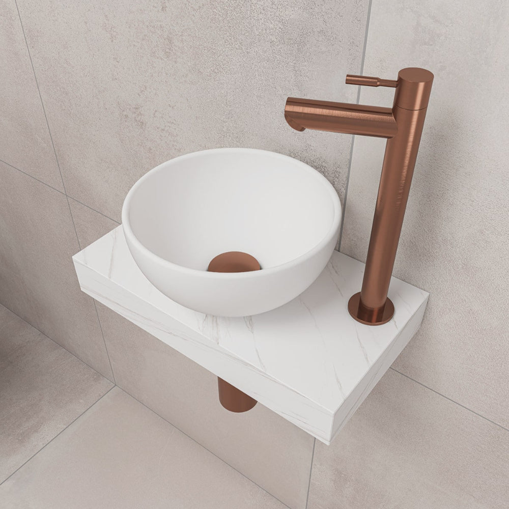 Met zijn strakke en moderne ontwerp past dit fonteinplateau perfect in een eigentijdse badkamer. De vrijhangende constructie geeft een gevoel van ruimte en minimalisme, terwijl de uitsparing een functioneel element toevoegt. De Ink Blocq fonteinplateu is ook zonder uitsparing mogelijk. De Calacatta mat afwerking zorgt voor een chique uitstraling en maakt dit fonteinplateau een elegante toevoeging aan elke toiletruimte.