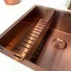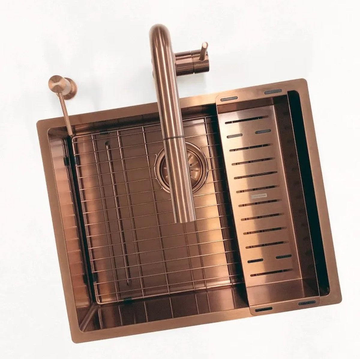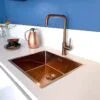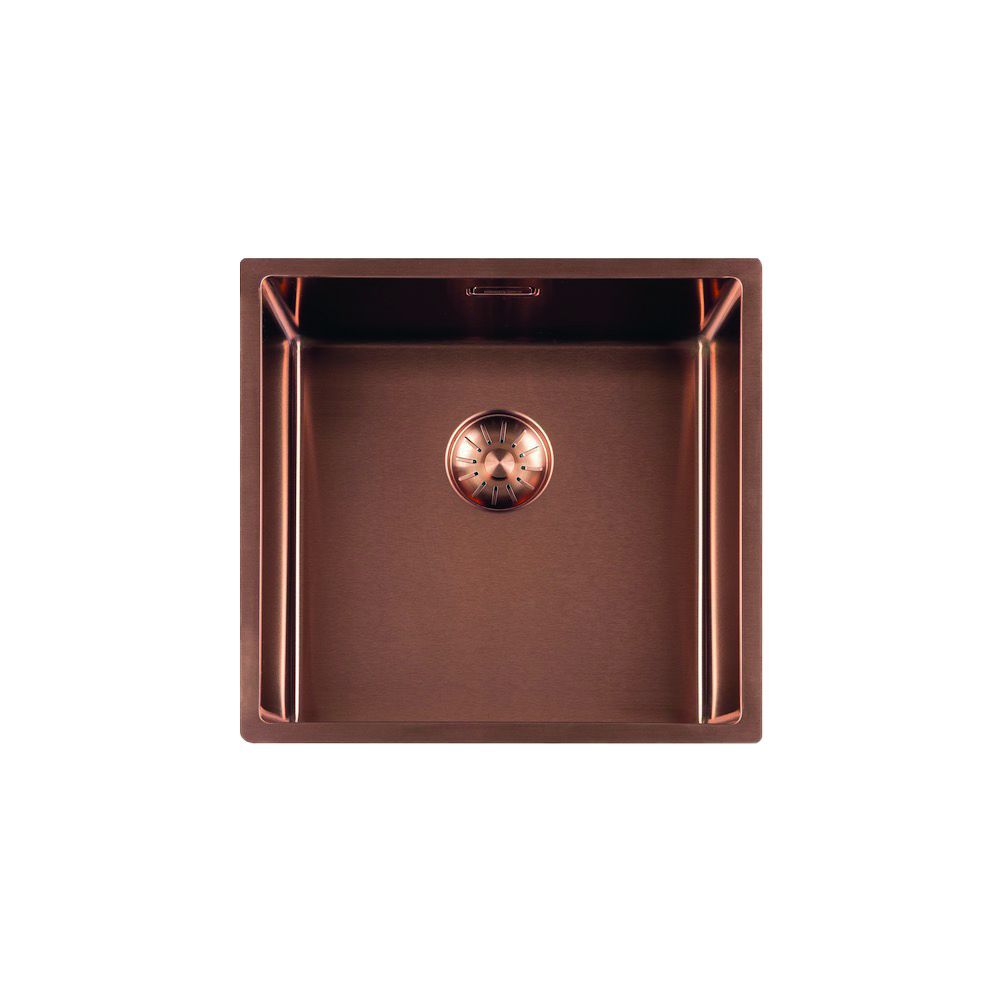 De spoelbak is voorzien van een vlakke en strakke bodem, wat niet alleen hygiënisch is maar ook praktisch in gebruik. De koperkleurige PVD-coating geeft de spoelbak een elegante en moderne uitstraling die een stijlvolle toevoeging vormt aan elke keukenruimte.