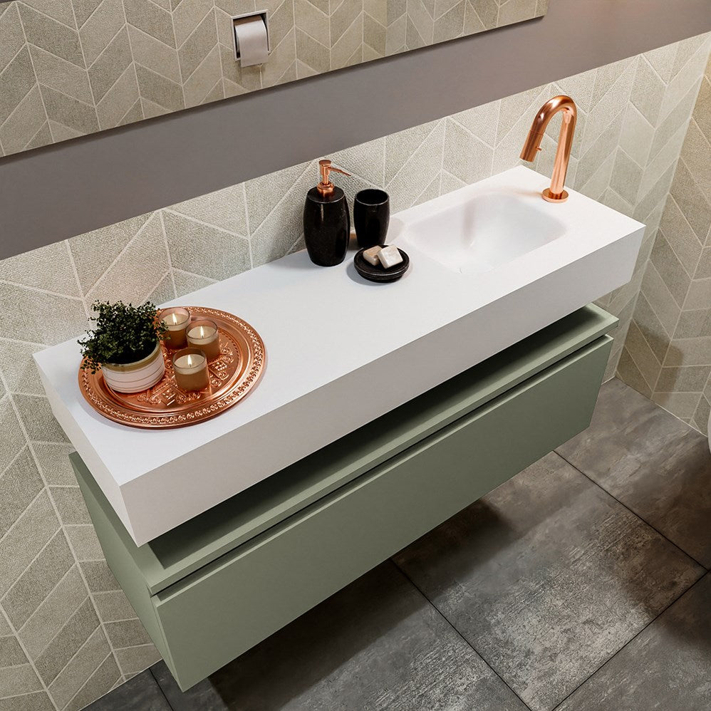 MONDIAZ ANDOR 100cm toiletmeubel army. LEX 100cm wastafel talc positie rechts. Met 1 kraangat