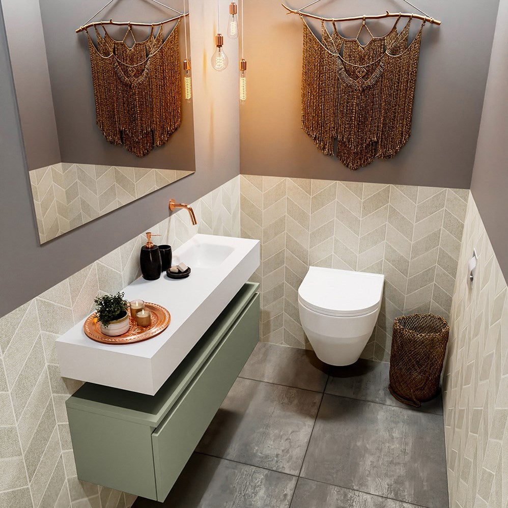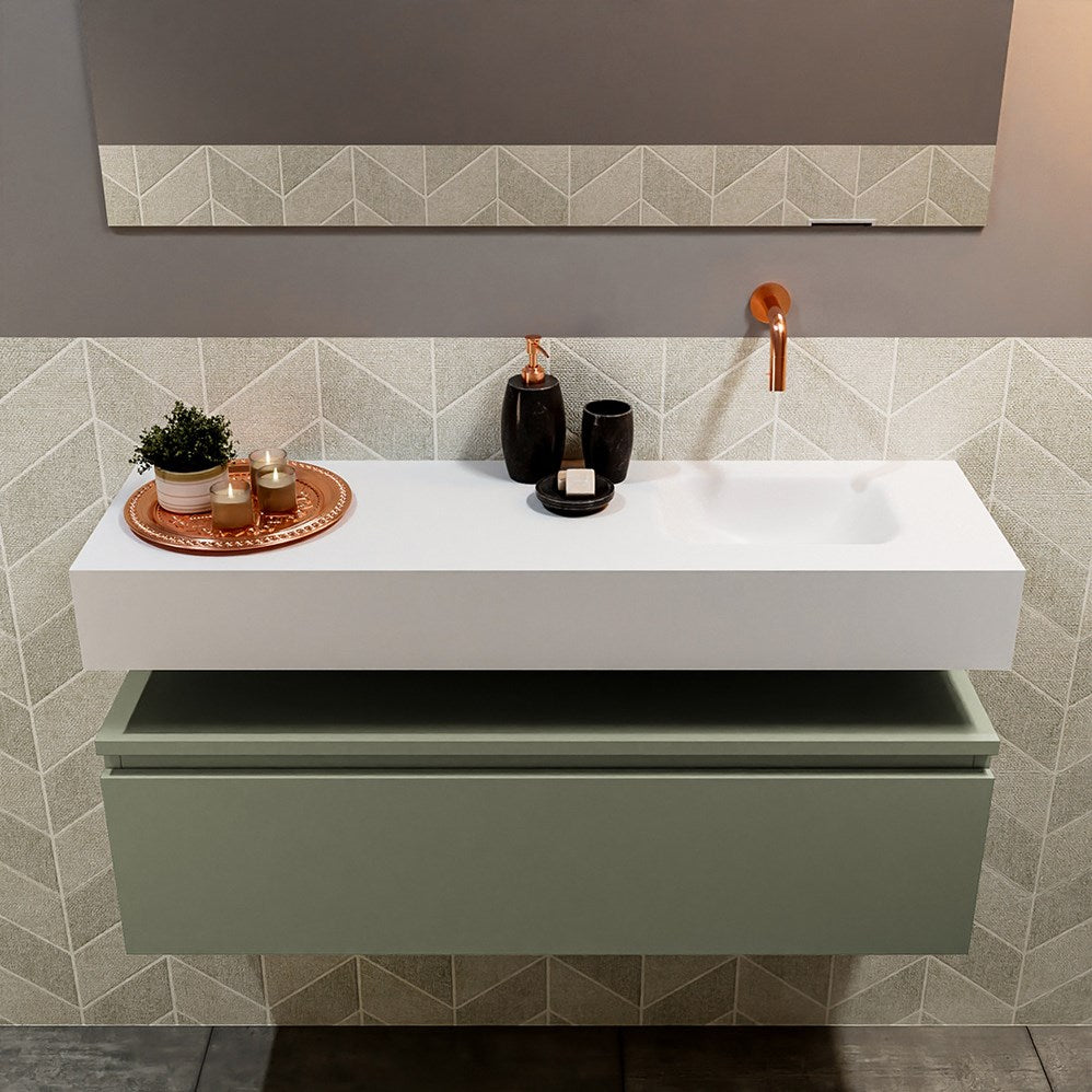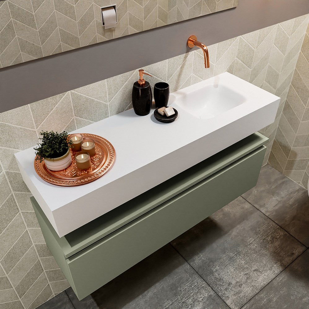 MONDIAZ ANDOR 100cm toiletmeubel army. LEX 100cm wastafel talc positie rechts. Zonder kraangat