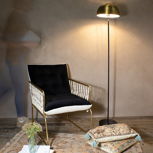 Deze NOMAA vloerlamp in zwart en goud metaal met zijn marmeren pootjes zal aan je verwachtingen voldoen. De ronde lampenkap met zijn gouden afwerking geeft hem een retrostijl. Deze creatie met een industrieel-chique uitstraling fleurt de kamer van jouw keuze op.